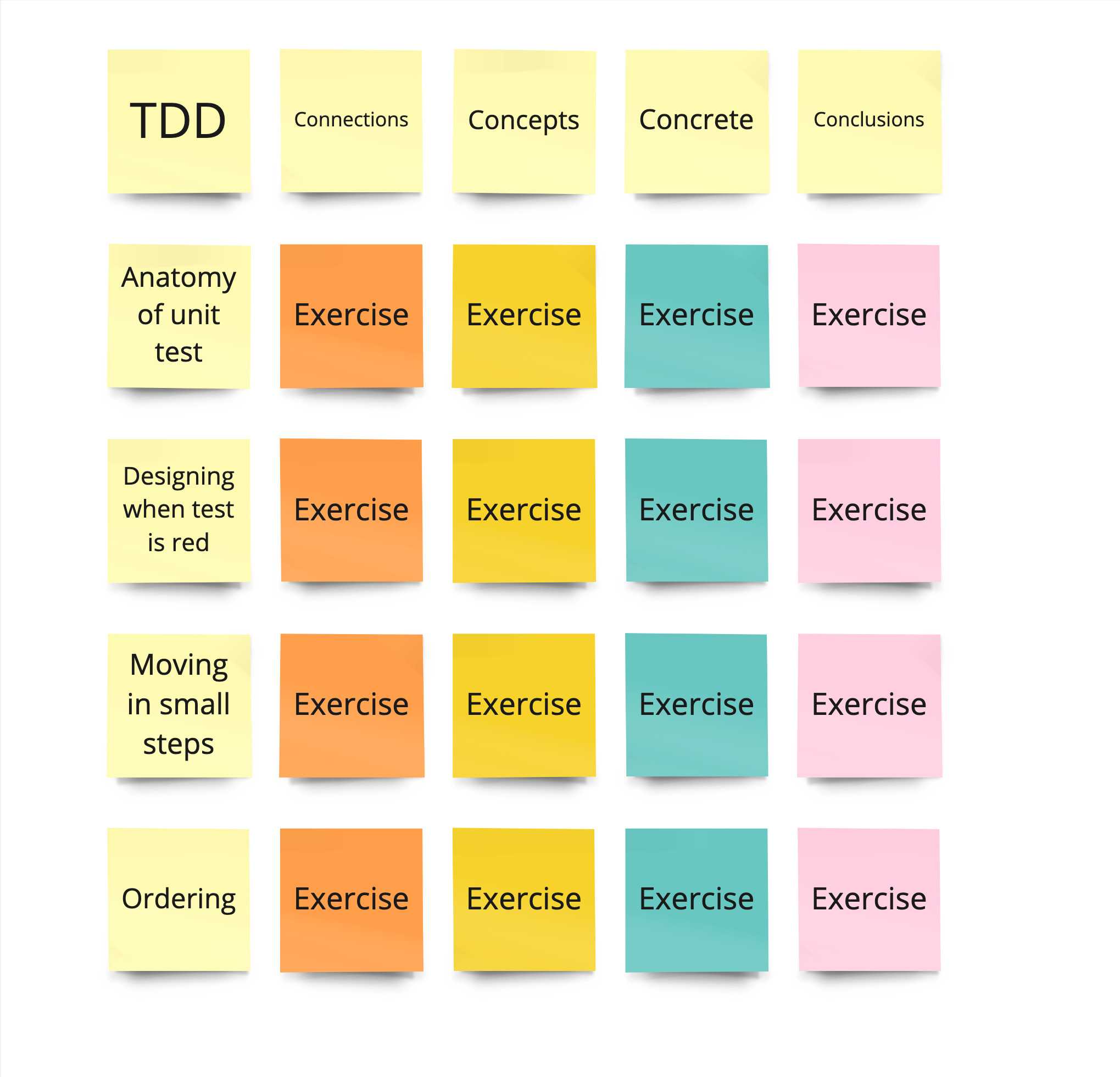 You create this by putting your topic in the top right, then underneath it come up with parts of that topic. Next for each of the parts come up with a connections exercise, concept exercise, concrete exercise, and conclusions. Keep each exercise between 10min and 20min.