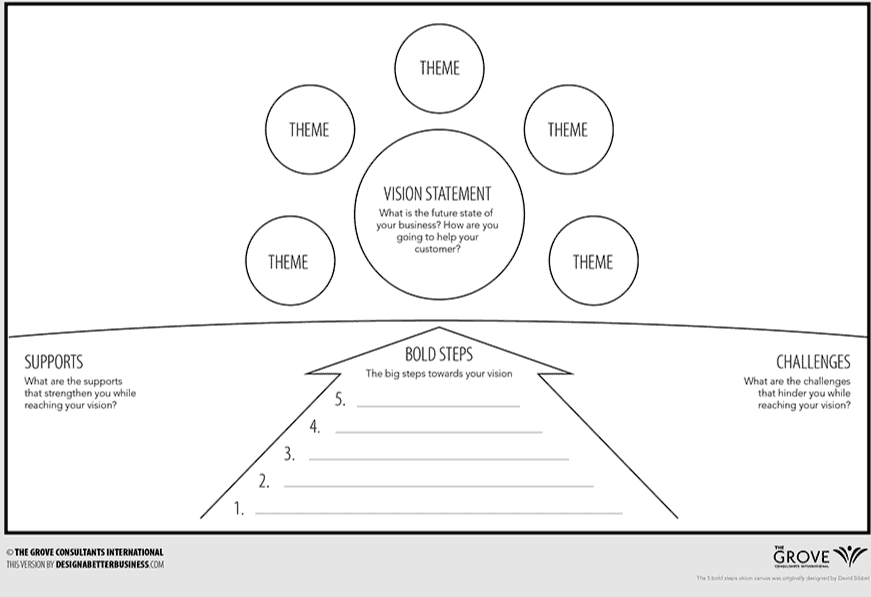 - Identify Bold Steps: Brainstorm and identify five significant, bold steps that will drive the organization towards the desired future state.