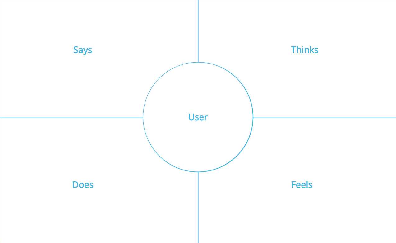 - Create four quadrants labeled: “Says,” “Thinks,” “Does,” and “Feels.”